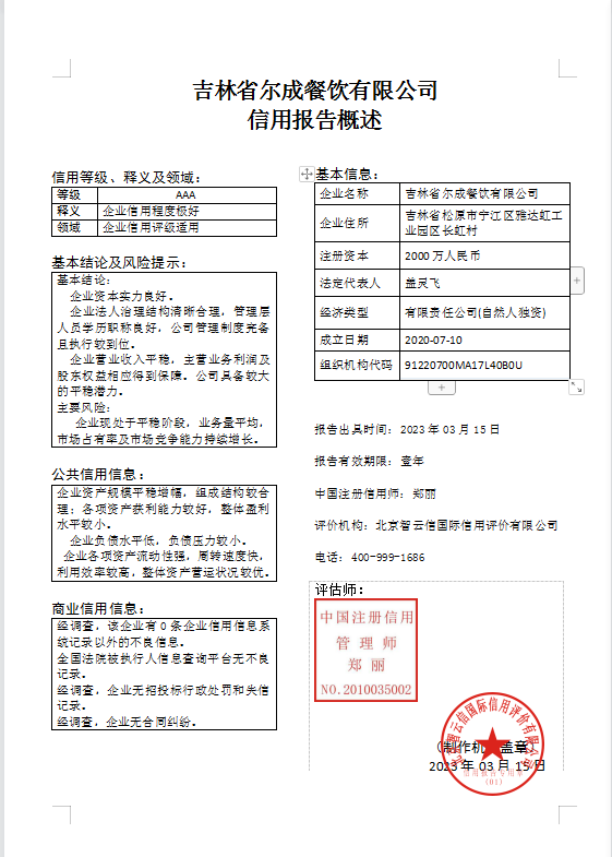 二、本信用證書和信用檔案是中立和中性的,它證明該單位已納入社會(huì)信用體系的監(jiān)督之中,任何組織和個(gè)人可以遵循誠信原則方便地對(duì)該單位進(jìn)行評(píng)價(jià)(表?xiàng)?、批評(píng)、建議);任何組織和個(gè)人可以方便地查詢?cè)搯挝涣己眯畔ⅰ⒉涣夹畔⒑驼男畔?。該單位也可以通過誠信經(jīng)營不斷增加信用分值和增加良好信用信息記錄,積累信用無形資產(chǎn)。三、根據(jù)該單位提供的相關(guān)資料,依據(jù)中華人民共和國信用行業(yè)標(biāo)準(zhǔn)Q/ZYX 002-2019《企業(yè)信用評(píng)價(jià)體系標(biāo)準(zhǔn)》,專業(yè)第三方信用評(píng)價(jià)機(jī)構(gòu)或信用認(rèn)證機(jī)構(gòu)對(duì)其信用等級(jí)評(píng)定為:AAA 級(jí)。四、提醒該信用檔案、信用證書及信用銘牌的使用者:請(qǐng)密切關(guān)注合作和交易對(duì)方的各項(xiàng)信用指標(biāo)或最新信用報(bào)告或年檢記錄信息,整體把握信用風(fēng)險(xiǎn),以保障合作和交易安全;請(qǐng)隨時(shí)關(guān)注合作和交易對(duì)方的信用動(dòng)態(tài)變化或跟蹤評(píng)價(jià)報(bào)告,及時(shí)把握信用趨勢(shì),以掌控商業(yè)風(fēng)險(xiǎn)。信用是企業(yè)的生命線;信用檔案是企業(yè)信用評(píng)價(jià)結(jié)果的動(dòng)態(tài)記錄,具有法律效力的信用證書是企業(yè)、商家及網(wǎng)站的第二“信用身份證”,信用檔案和信用證書是企業(yè)、商家及網(wǎng)站獲得客戶信任、促成合作和交易的基礎(chǔ),是大眾消費(fèi)、合作和交易決策的重要依據(jù),是我國社會(huì)信用體系建設(shè)的公平保障體系。