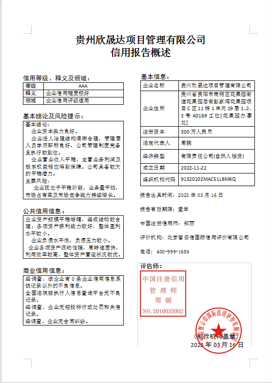一、專業(yè)第三方信用評價機構根據(jù)國務院《社會信用體系建設規(guī)劃綱要(2014-2020年)》(國發(fā)2014第21號)建設要求,依據(jù)中華人民共和國信用行業(yè)標準對該單位的相關信用信息進行綜合評價,并依法出具信用證書和建立信用檔案公示,接受社會監(jiān)督。信用分析師認為,同等條件下,該單位的可信度、信任度和社會責任度相對很高。