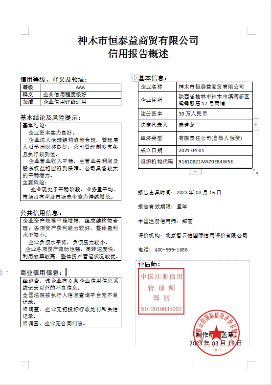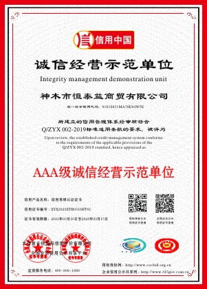 二、本信用證書和信用檔案是中立和中性的,它證明該單位已納入社會信用體系的監(jiān)督之中,任何組織和個人可以遵循誠信原則方便地對該單位進行評價(表楊、批評、建議);任何組織和個人可以方便地查詢該單位良好信息、不良信息和整改信息。該單位也可以通過誠信經營不斷增加信用分值和增加良好信用信息記錄,積累信用無形資產。三、根據(jù)該單位提供的相關資料,依據(jù)中華人民共和國信用行業(yè)標準Q/ZYX 002-2019《企業(yè)信用評價體系標準》,專業(yè)第三方信用評價機構或信用認證機構對其信用等級評定為:AAA 級。四、提醒該信用檔案、信用證書及信用銘牌的使用者:請密切關注合作和交易對方的各項信用指標或最新信用報告或年檢記錄信息,整體把握信用風險,以保障合作和交易安全;請隨時關注合作和交易對方的信用動態(tài)變化或跟蹤評價報告,及時把握信用趨勢,以掌控商業(yè)風險。信用是企業(yè)的生命線;信用檔案是企業(yè)信用評價結果的動態(tài)記錄,具有法律效力的信用證書是企業(yè)、商家及網站的第二“信用身份證”,信用檔案和信用證書是企業(yè)、商家及網站獲得客戶信任、促成合作和交易的基礎,是大眾消費、合作和交易決策的重要依據(jù),是我國社會信用體系建設的公平保障體系。