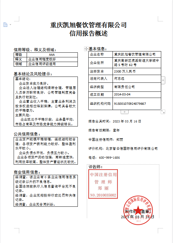 二、本信用證書和信用檔案是中立和中性的,它證明該單位已納入社會信用體系的監(jiān)督之中,任何組織和個人可以遵循誠信原則方便地對該單位進行評價(表楊、批評、建議);任何組織和個人可以方便地查詢該單位良好信息、不良信息和整改信息。該單位也可以通過誠信經(jīng)營不斷增加信用分值和增加良好信用信息記錄,積累信用無形資產(chǎn)。三、根據(jù)該單位提供的相關資料,依據(jù)中華人民共和國信用行業(yè)標準Q/ZYX 002-2019《企業(yè)信用評價體系標準》,專業(yè)第三方信用評價機構或信用認證機構對其信用等級評定為:AAA 級。四、提醒該信用檔案、信用證書及信用銘牌的使用者:請密切關注合作和交易對方的各項信用指標或最新信用報告或年檢記錄信息,整體把握信用風險,以保障合作和交易安全;請隨時關注合作和交易對方的信用動態(tài)變化或跟蹤評價報告,及時把握信用趨勢,以掌控商業(yè)風險。信用是企業(yè)的生命線;信用檔案是企業(yè)信用評價結果的動態(tài)記錄,具有法律效力的信用證書是企業(yè)、商家及網(wǎng)站的第二“信用身份證”,信用檔案和信用證書是企業(yè)、商家及網(wǎng)站獲得客戶信任、促成合作和交易的基礎,是大眾消費、合作和交易決策的重要依據(jù),是我國社會信用體系建設的公平保障體系。
